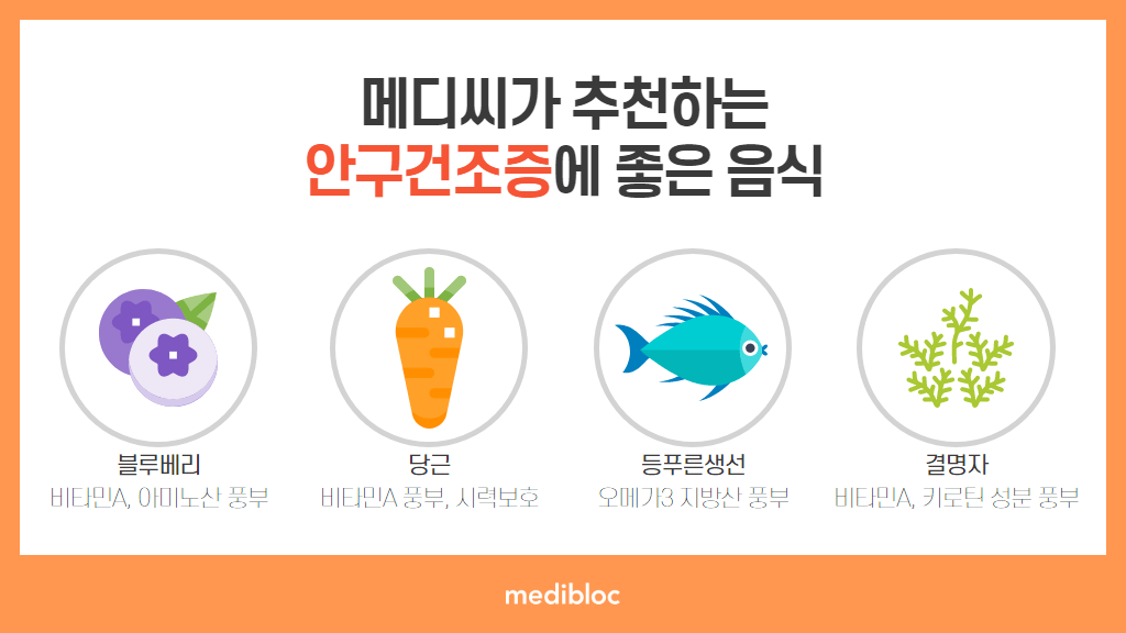 당근은 비타민A가 풍부해 눈 건강에 좋다고 합니다. 어렸을 적, 당근을 싫어하는 메디씨에게 엄마가 토끼가 당근을 많이 먹어서 눈이 좋다고 했던 기억이 납니다. 비타민A는 항산화 작용을 하여 눈의 노화와 시력 감퇴에 예방해주는 역할을 한다고 합니다. 또한 눈물의 구성성분의 균형을 바로잡아 눈물이 쉽게 마르지 않도록 해주는 효과가 뛰어난 불포화지방산인 오메가3가 풍부한 참치, 고등어, 연어 등과 같은 등 푸른 생선도 눈 건강에 큰 효과가 있다고 합니다. 더불어, 안토시아닌 성분이 함유되어 있는 블루베리는 눈의 건조함을 개선해줄 뿐 아니라 야맹증, 근시 완화에 도움을 주는 역할을 한다고 하니 퇴근길에 이마통에 들려 눈에 좋은 식품들을 듬뿍 사가야겠습니다.*(출처: 매경헬스 2017)