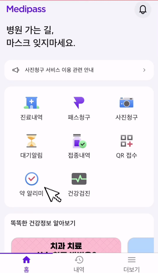 STEP 1. 메디패스 앱을 열고 홈 화면 상단의 약 알리미 아이콘을 클릭해주세요.