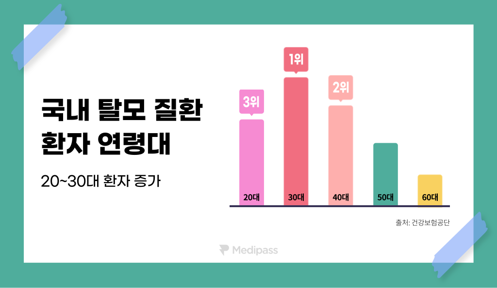 최근 젊은 20~30대 층에서 탈모 환자가 급격히 늘어나고 있습니다. 국민건강보험공단의 건강보험 진료데이터에 따르면, 2020년 기준으로 국내 탈모를 겪고 있는 전체 23만 명 중 30대가 5만 2천 명으로 가장 많은 수를 차지하고 있다고 하는데요. 혹시 여러분 중 탈모로 인해 탈모약을 드시는 분 계시나요?