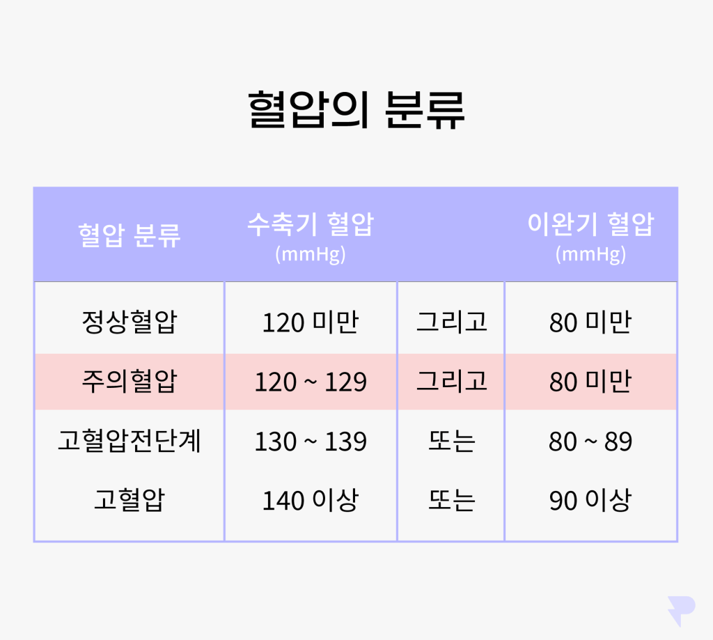 그러나 그보다 낮은 수치라도 혈압이 높아질수록 심뇌혈관 질환에 대한 위험도가 높아지기 때문에 정상 수치보다 높지만 고혈압 수치보다는 낮은 수치를 고혈압 전 단계와 주의 혈압으로 나누어 분류하고 있어요. 따라서 고혈압 전 단계와 주의 혈압이라면 고혈압으로 진행될 가능성이 크다는 것을 인지하고 혈압 관리에 각별한 주의를 기울여야 해요.