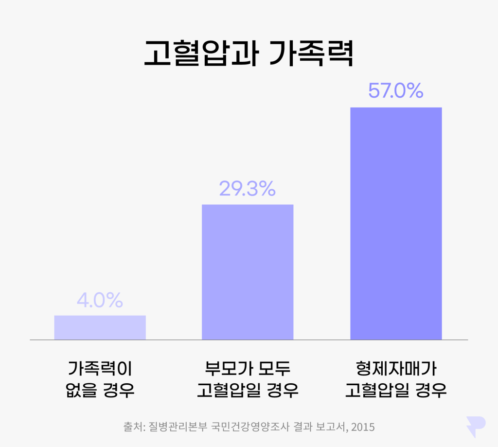 부모 모두 고혈압인 사람의 29.3%, 형제자매가 고혈압인 사람의 57%가 고혈압이라는 질병관리본부 국민건강영양조사 결과가 있을 정도로 고혈압은 가족력의 영향을 많이 받아요. 만약 내 가족 중 고혈압이 있다면? 혈압 관리에 좀 더 신경을 써보는 것이 어떨까요?