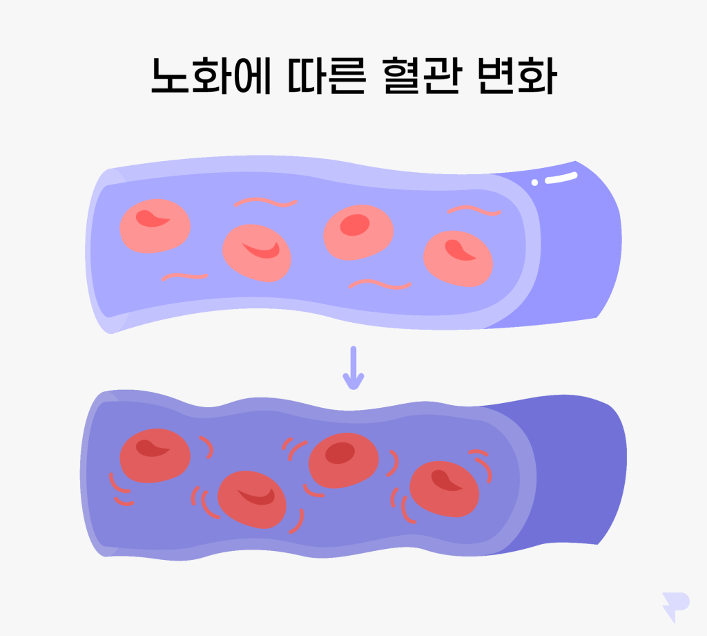 대한고혈압학회 2018년 고혈압 진료지침에 따르면 65세 이상 연령층의 고혈압 유병률은 65.2%로 매우 높아요. 우연히 지나가는 길에 마주치는 65세 이상 어르신 3명 중 2명은 고혈압을 앓고 있다고 볼 수 있죠. 이처럼 연령이 높을수록 고혈압이 발생할 확률은 높아져요. 그 이유는 혈관! 나이가 들면서 노화로 인해 점차 혈관 탄력이 감소하고 딱딱하게 경직되어 가는데 이는 혈압을 높이는 요인이 되기 때문이에요.