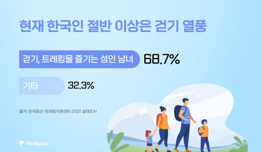 보통 길게 이어진 산길 혹은 숲길을 오래 걷는 것을 트레킹이라고 부르는데요. 최근 우리나라 곳곳에 있는 트레킹 코스를 통해 아름다운 자연경관을 벗 삼아 여유롭게 걷는 사람들이 늘고 있습니다. 한국등산·트레킹지원센터에서 실시한 ‘2021년 등산·걷기(트레킹) 국민의식 실태조사’에 따르면 전체 성인남녀 중 68.7%가 걷기 활동을 즐기고 있을 정도로, 대한민국 인구의 절반 이상은 걷는 활동을 즐긴다고 볼 수 있죠.