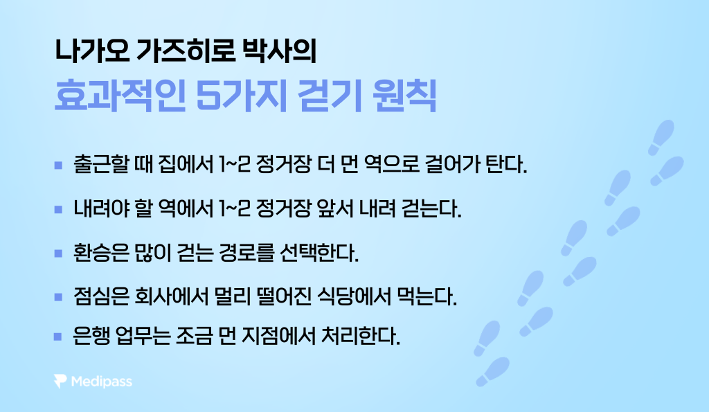 하지만 우리는 바쁜 일상에서 오롯이 나를 위해 지친 내면을 살펴보기 위해 혼자 걷는 시간을 따로 갖기란 쉽지 않습니다. 누구보다도 빨리 취업, 이직, 성공, 미래를 위해 치열하게 살아가고, 남들보다 뒤처지지 않도록 쉼 없이 달리며 끊임없이 나아가다 보니 시간적 여력이 많이 없죠. 그래서 나가오 가즈히로 박사는 매일 출퇴근길, 거리와 지하철에서도 실천할 수 있는 손쉬운 걷기 방법을 제시했는데요. 효과적인 5가지 걷기 원칙은 아래와 같습니다.