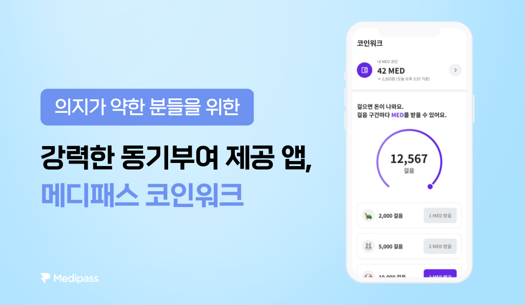 강력한 동기부여를 제공하는 메디패스 코인워크를 사용해보세요. 메디패스 코인워크란, 나의 하루 걸음 수를 측정하고 걸은 만큼 실 가상자산인 MED 코인을 보상으로 제공하는 어플 서비스인데요.별도의 장비나 준비물 필요 없이 우리의 일상에서 하루도 빼먹지 않고 가지고 다니는 스마트폰 하나만으로 매일 걸음 수를 측정 및 기록할 수 있고, 심지어 걷는 만큼 실제 보상을 주는 강력한 동기부여까지 얻을 수 있습니다.