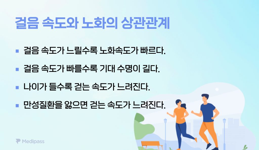 첫째, 걸음 속도가 느릴수록 노화 속도가 빠르고 반대로 걸음 속도가 빠를수록 기대 수명이 길다.