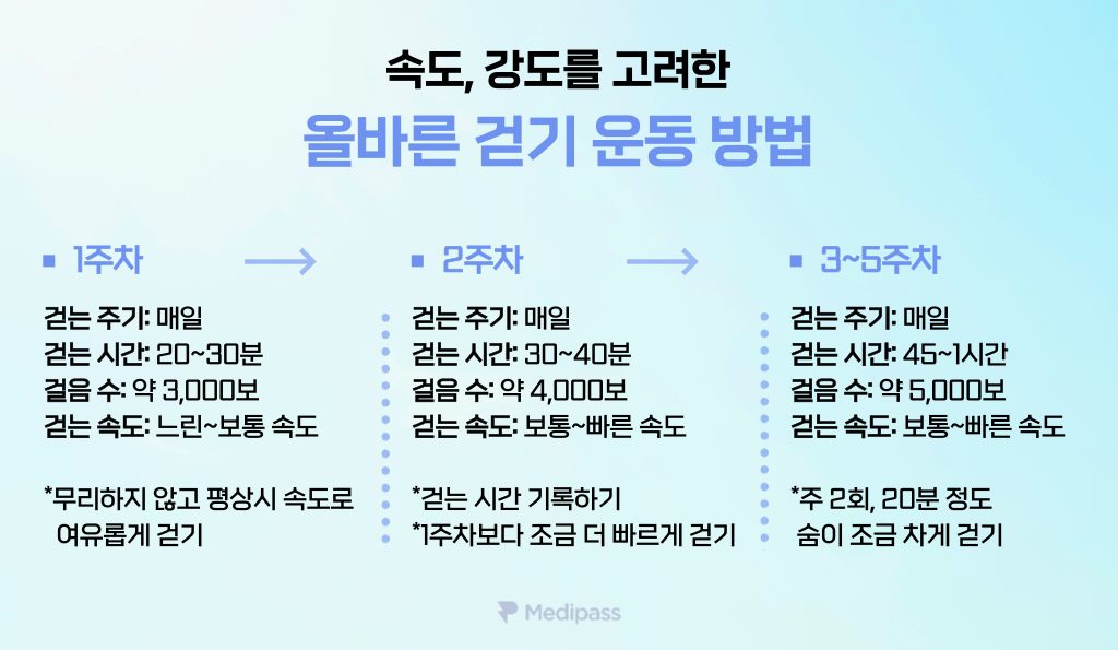 추가로 당뇨병, 고혈압 등 만성질환을 앓고 있다면 위와는 다른 방식으로 걸어야 하는데요.