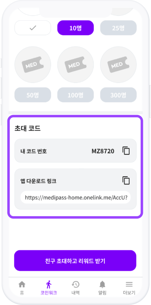 STEP 4. 이후 친구가 해당 추천인 코드 혹은 링크를 통해 메디패스 코인워크를 시작하면 참여 완료!