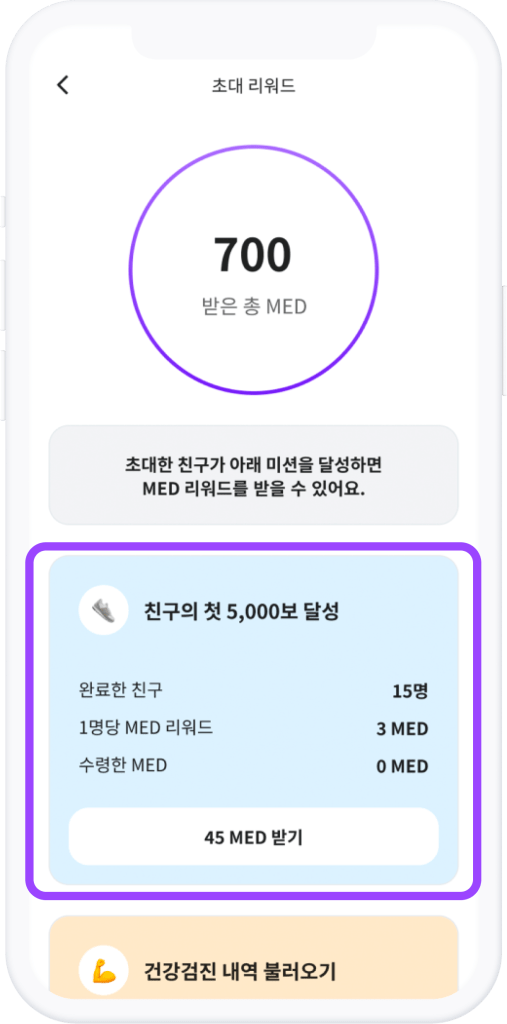 *초대한 친구가 걷기, 미션 등을 완료 후 MED 받기 버튼을 누르면 이후 나에게도 추가 MED가 지급돼요.