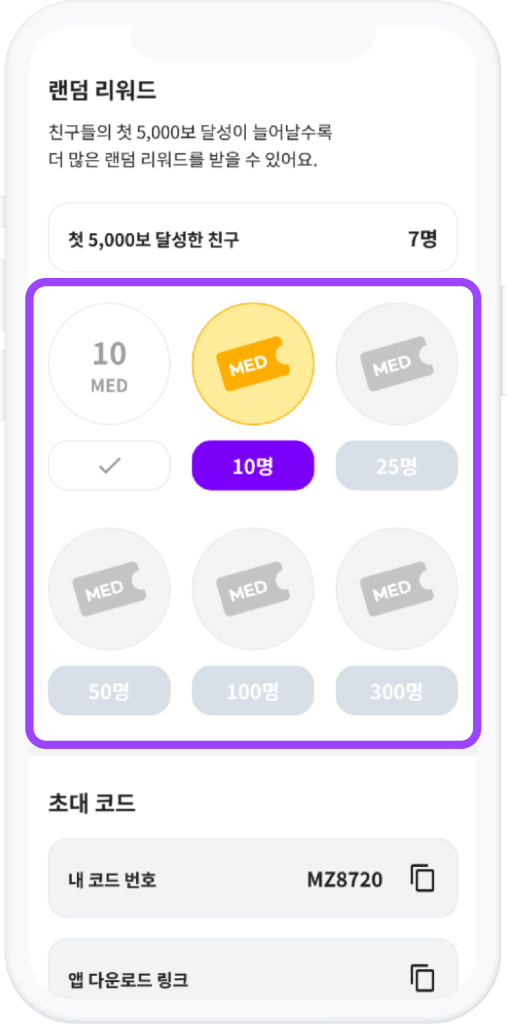 이후 5명, 10명, 50명, 100명, 300명… 계속해서 초대 인원 달성하면? 꽝 없는 MED 복권 지급!