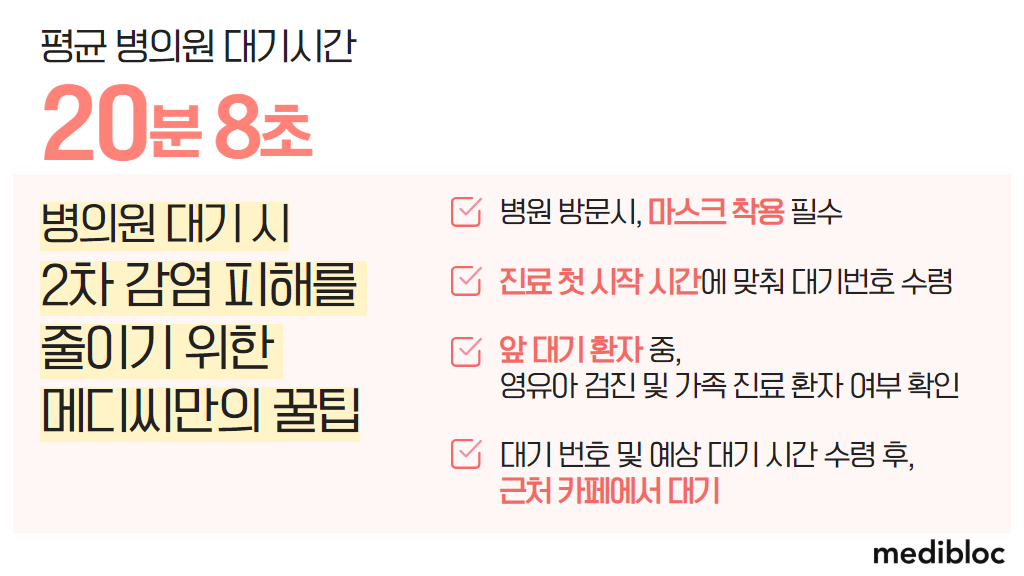 인터넷에 나온 2017년 보건복지부에서 전국 5,000가구 만 15세 이상 가구원을 대상으로 진행한 ‘의료서비스 경험조사’에 따르면, 진료 당일 병·의원에서 3분 남짓한 진료를 받기 위해 평균 20분 8초의 시간을 소모한다고 합니다. 이는 2차 감염에 민감한 소아과 방문 환자 및 보호자들에게 매우 긴 시간으로 다가옵니다. 2차 감염문제뿐만 아니라, 아침에 1-2시간 반차를 내고 온 워킹맘에게는 이 시간이 매우 빠듯합니다. 20분만 기다리면 양호한 편입니다. 앞에 영유아검진이나 접수 없이 함께 들어가는 형제/자매가 있으면 시간은 기하급수적으로 늘어납니다.