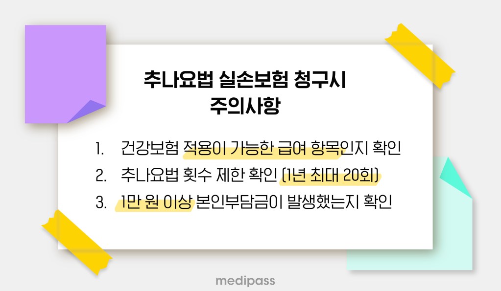 하지만 추나요법이 급여항목으로 변경된 것을 아직 모르는 분이 많습니다. 간혹 보험 설계사분도 헷갈리신다고 하니…….💦 추나요법은 건강보험은 물론이고 실손보험 청구가 가능하다는 사실을 반드시 기억해주세요!