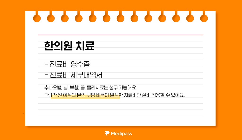 서류는 진료비 영수증과 진료비 세부내역서만 챙겨 제출하면 끝! 한의원도 제출서류는 다른 일반 병원과 다를 바 없답니다. 단, 1만 원 이상의 본인 부담 비용이 발생한 치료비만 실비 적용 가능하고 추나요법은 1년에 최대 20회까지만 보상받을 수 있다는 점 명심해주세요.