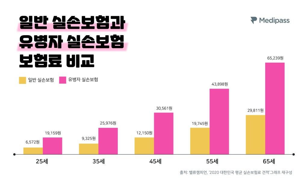 실제로 확인해볼까요? 만 55세의 평균 실손 보험료를 비교해보면 일반 실손은 19,745원, 유병자 실손은 43,898원으로 유병자 실손보험료가 약 2.2배 더 비싸답니다. (출처: 밸류챔피언)