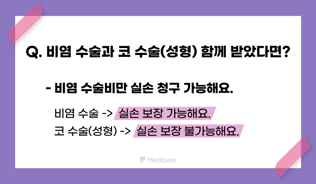 성형외과 또는 이비인후과에서 비염 수술 시 코 성형과 함께하는 것을 권유하는 경우도 있는데요. 이때 실손 보장은 비염 수술과 코 수술 둘 다 적용받는 것이 아닌, 비염 수술만 적용받을 수 있다는 점을 주의해주세요. 코 수술의 경우 미용을 목적으로 한 수술이기에 실손 보장 제외 항목이라는 사실!