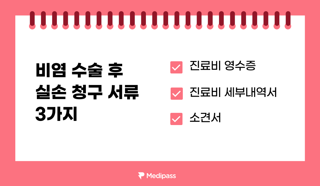 그렇다면 수술 이후 실손 청구 서류 준비는? 진료비 영수증, 진료비 세부내역서, 소견서를 준비해주세요. 소견서의 경우 보통 보험사에서 해당 진료가 진짜 치료 목적으로 수술했는지를 확인하기 위해 요청하는 경우가 종종 있으니 미리 챙겨두면 좋답니다.