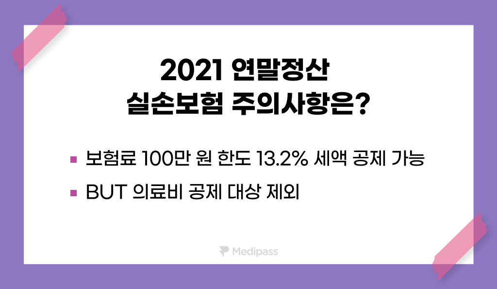 그런데 이를 모르고 보험료 공제와 의료비 공제 모두 신청했다면? 의료비 공제한 부분만큼 추가 가산세를 물게 된다고 하니 만약 내가 올해 실손보험을 통해 의료비를 보장받은 내역이 있다면 해당 금액을 제외한 의료비만 공제 신청을 해주셔야 한다는 점 미리 확인해주세요.