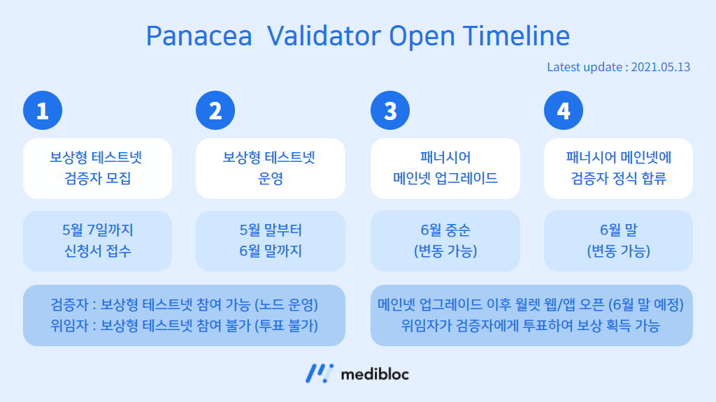 검증자와 위임자가 모두 참여하며 투표가 가능한 월렛 웹/앱의 공식 오픈 시점은 6월 말을 목표로 하며, 그 전 약 한 달의 기간 동안에는 검증자 보상형 테스트넷을 운영할 예정입니다. 보상형 테스트넷 기간에는 사전 참여 신청을 한 유저들에 한하여 노드를 구축하고 운영하며 검증자로서 블록 생성에 참여하게 됩니다. 그리고 보상형 테스트넷 종료 시점에 각자가 얻은 보상에 비례하여, 메인넷 업그레이드 이후 MED 보상을 지급받습니다.