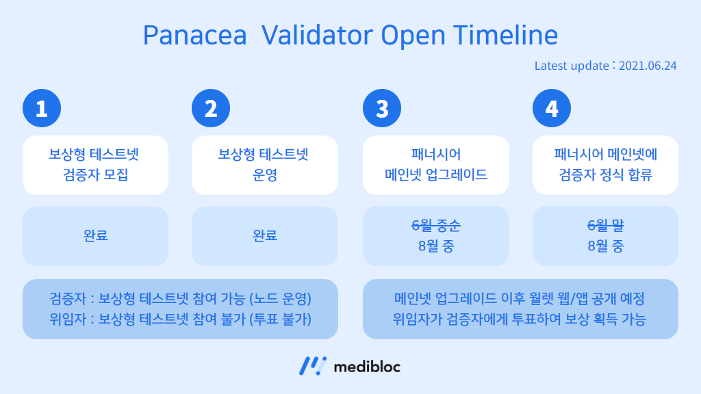 지난 공지에서 패너시어 메인넷 업그레이드 및 검증자 정식 합류 일정을 6월 중순부터 6월 말로 말씀드렸으나, 검증자 팀 그리고 메디블록 팀 내부 논의 결과, 메디블록의 블록체인 패너시어를 기존 계획했던 것보다 더 발전된 방향으로 업그레이드하기로 결정하였습니다. 따라서 메인넷 업그레이드 및 검증자 공식 합류 일정이 8월 중으로 연기되었음을 안내드립니다. 업그레이드 배경 및 내용에 대해서는 다음 내용을 참고해주시기 바랍니다.