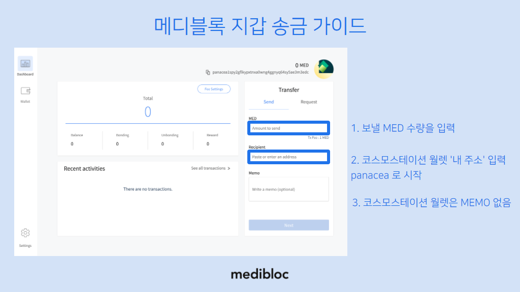메디블록 지갑에서 코스모스테이션(Cosmostation) 앱 월렛으로 MED 코인을 송금하는 방법
