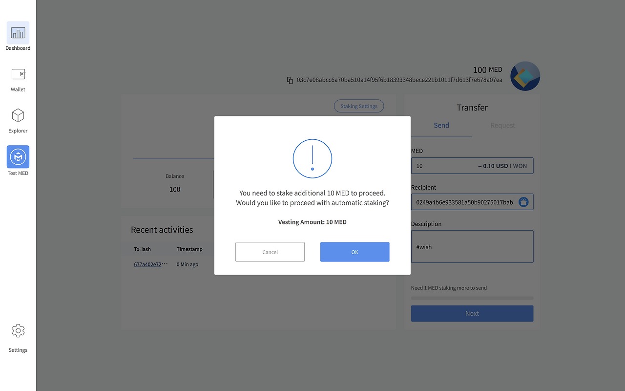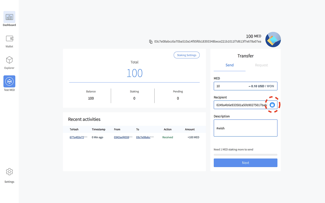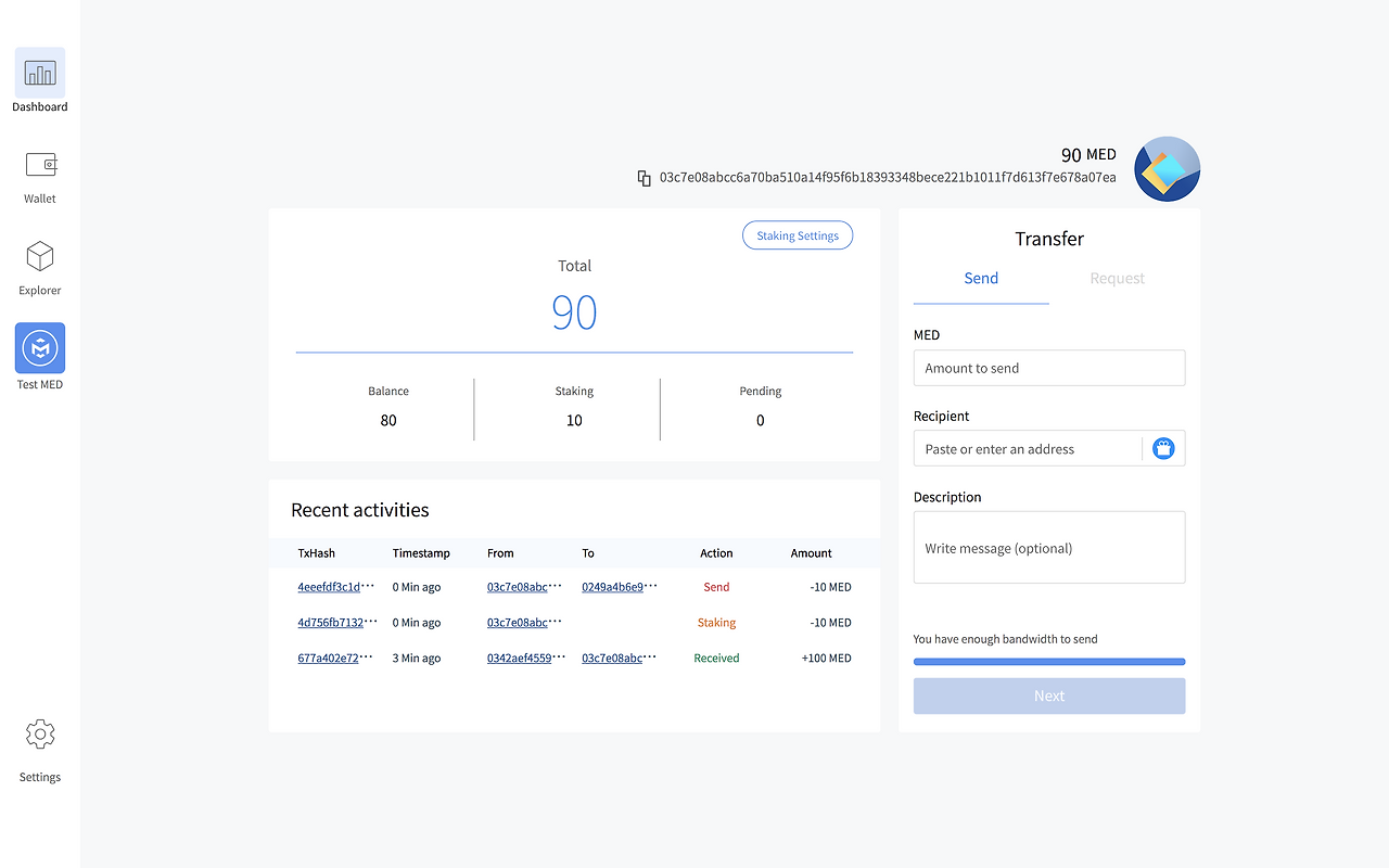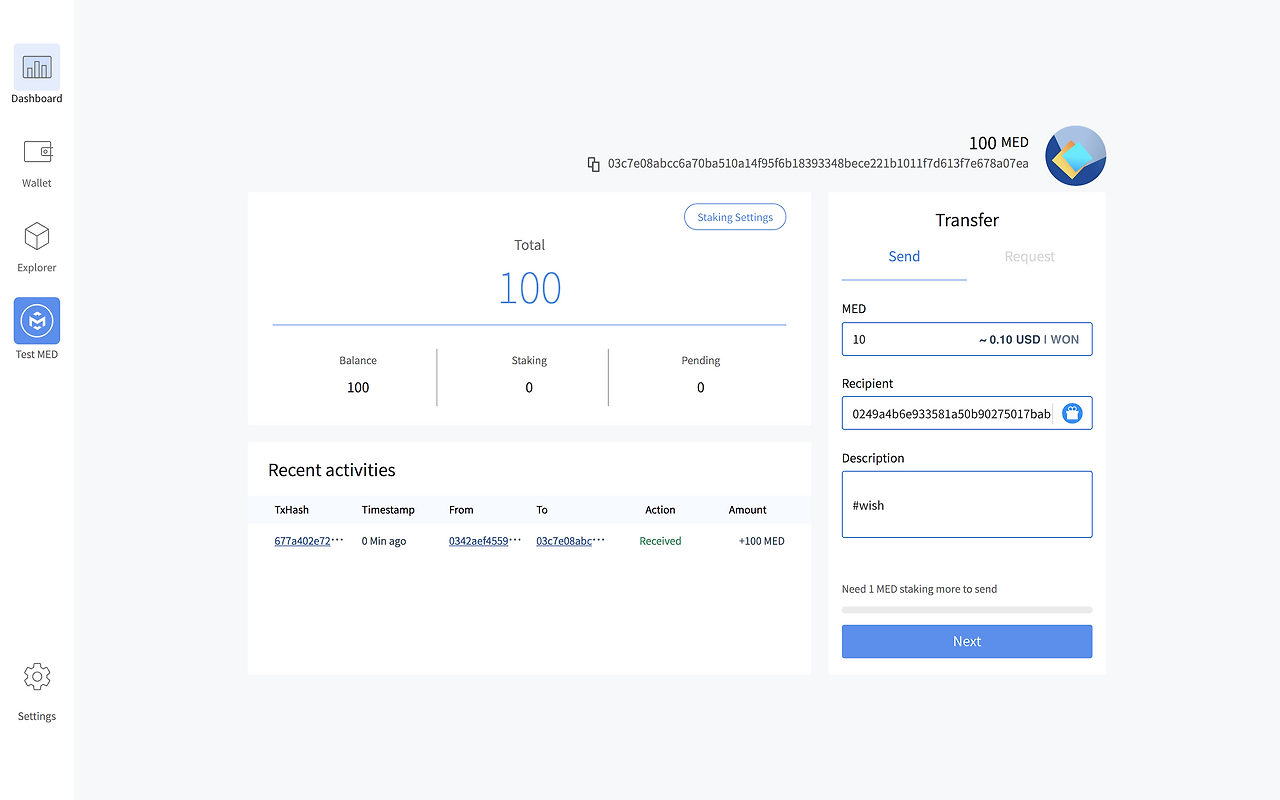 *트랜잭션을 발생시키기 위해서는 1MED 이상의 Staking이 필요합니다. (1MED당 일주일 기준 트랜잭션 한 개 생성 가능)
