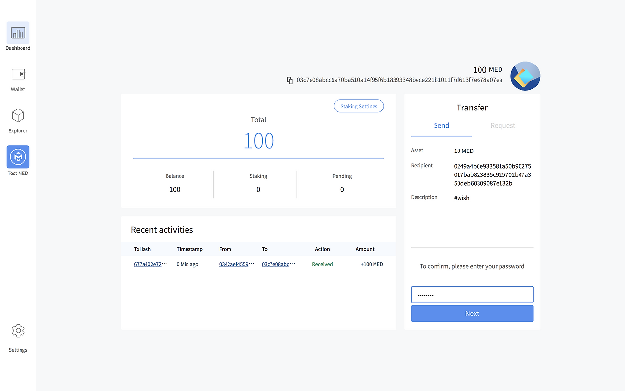 *테스트넷 지갑에서 활용하는 MED는 테스트 코인으로 현물가치를 가지지 않습니다.