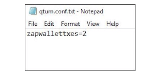 지갑이 실행될 때 설정 파일인 ‘qtum.conf’을 읽게 됩니다. 그러므로 해당 파일에 ‘zapwallettxes=2’ 명령어를 삽입하고 지갑을 재시작하면 됩니다. 아래의 순서대로 설정 파일을 생성하세요. 이미 생성되어 있다면 명령어 수정만 하시면 됩니다.