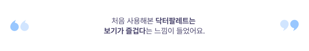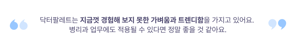 이제는 전통적인 의학적 지식과 기술 외에 디지털 기술을 포함하여 빠르게 변화하는 사회를 알지 못하면 한계가 있을 것이라는 생각을 종종 하는데요. 이번 기회를 통해 저도 많이 배우고 닥터팔레트의 서비스 발전에도 미약하게나마 도움이 되었으면 좋겠습니다.