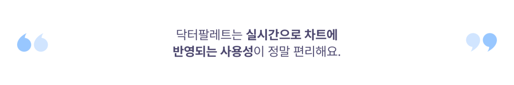 사실 자문의사로 함께하기 전까지는 클라우드 EMR이 무엇인지에 대한 이해도도 낮았고, 막연한 불안함이 있었어요. 클라우드 EMR을 사용해 본 경험이 없기에 기존에 사용했던 사용감이 익숙한 차트 시스템과 다르다는 것으로 인한 불안함이었죠. 그런데 닥터팔레트를 써보니 그 인식이 모두 깨졌습니다.