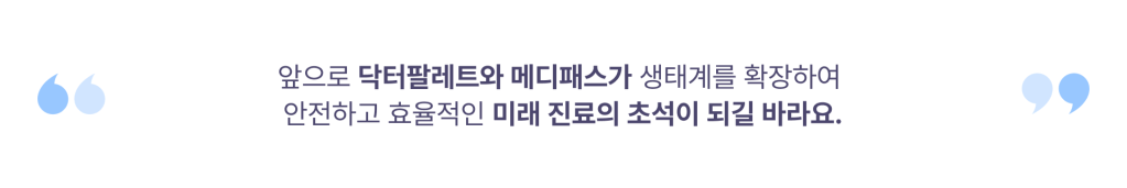 그런데 현재 닥터팔레트에 연동시킬 수 있는 PHR 서비스인 메디패스가 이런 기능을 하는 것으로 알고 있어요. 메디패스의 주체는 환자로, 본인의 의료정보를 당사자가 주체가 되어 보유하고 왜곡되지 않은 개인 의료 정보를 어플리케이션을 통해 일상에서 활용할 수 있다는 점이 저의 바람과 통하는 지점이죠. 앞으로 닥터팔레트와 메디패스가 생태계를 크게 확장하여 안전하고 효율적인 미래 진료의 초석이 되었으면 좋겠습니다.