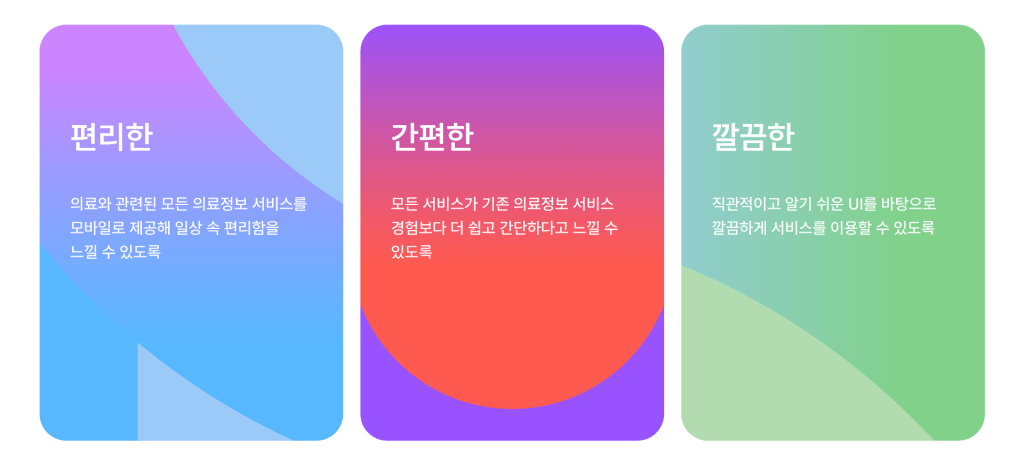 상황에 맞는 컬러 사용을 통해, 서비스에서 전달하고자 하는 메세지를 좀 더 효과적으로 전달하고자 합니다. 컬러를 통해 메디패스는 의료정보를 다루는 진중한 서비스에서 때로는 명쾌하고 즐거운 의료생활을 하며, 다양한 도전을 하는 서비스로 다가가고자 합니다.