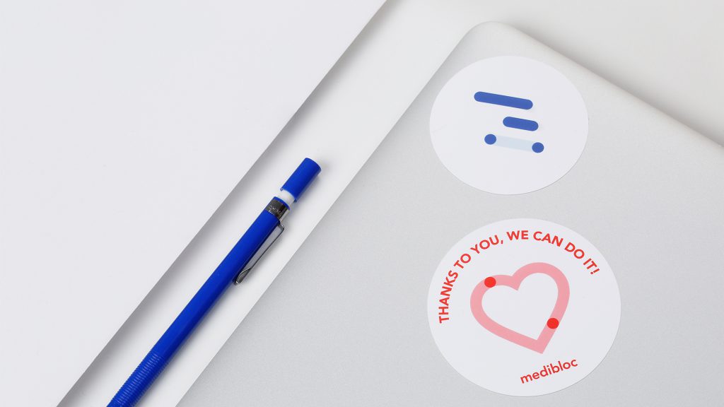 메디블록의 스티커는 “당신 덕분에 우리는 해낼 수 있다!”라는 메세지를 통해 메디블록 구성원으로서의 자부심과 사명, 책임감을 기분 좋게 부여할 수 있도록 제작하였습니다. 별, 하트 스티커는 메디블록의 로고에 사용된 그래픽 모티브를 이용하여 제작했습니다. 메디블록의 로고에 대한 더 깊은 이야기가 궁금하시다면 다음의 글을 참고해주세요.
