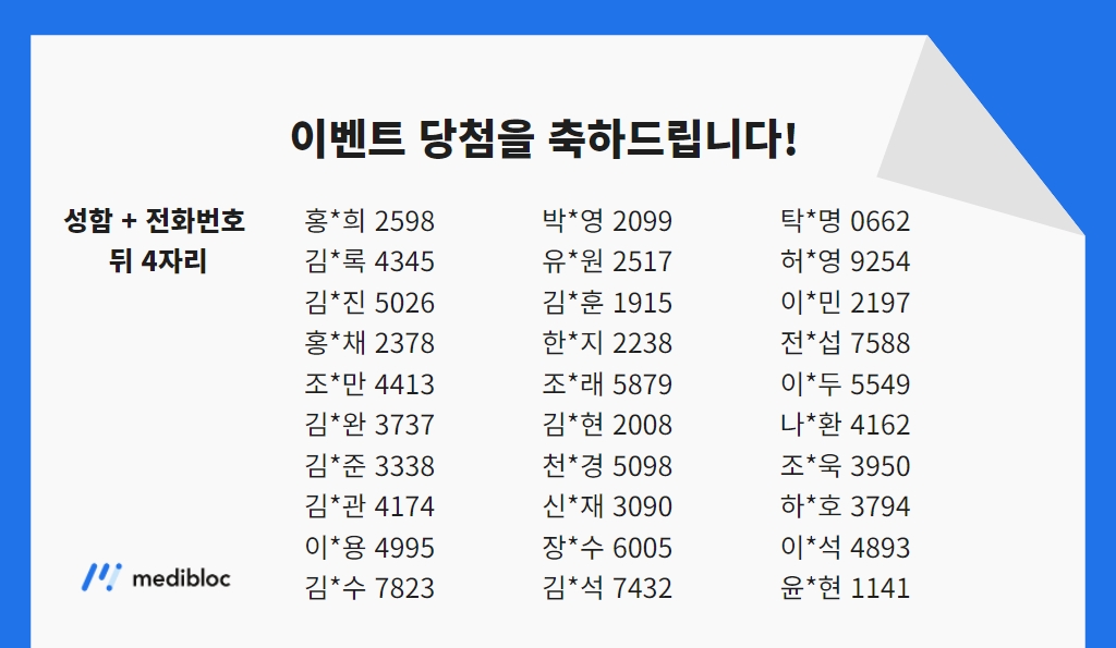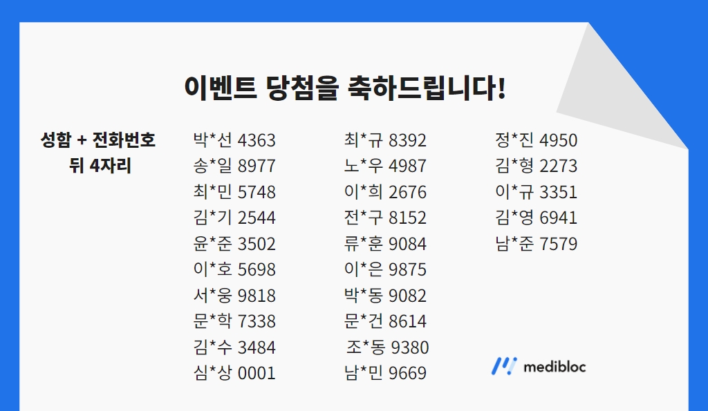 ▪ 당첨자 중 메디블록 굿즈 당첨자 5분은 신청하신 이메일로 연락드렸으니 기한 내 회신을 해주세요.