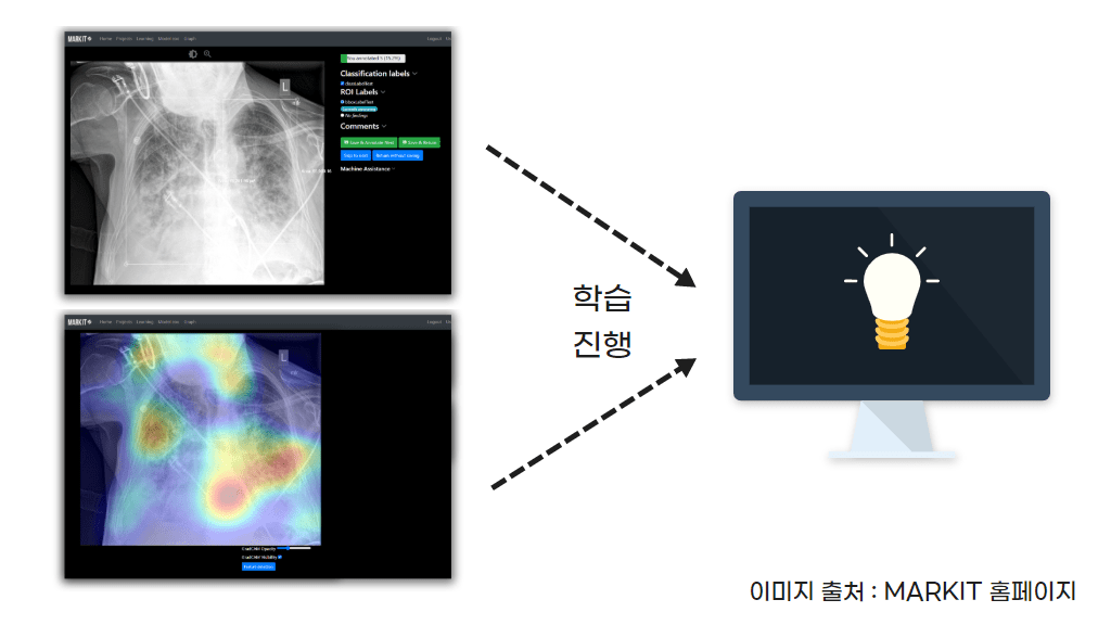 이 사례를 MARKIT에 적용해보도록 하세. 병원에서 초음파 검사나 엑스레이 검사 등을 진행한 적이 있을 걸세. 이때 영상이나 사진을 보면서 의사는 어디에 물혹이 있고, 어디에 악성 종양이 있음을 말해준다네. 이런 과정을 인공지능이 대체하거나 보조할 수 있도록 하는 것이 MARKIT의 최종 목표라고 보면 된다네. 하지만 이를 위해선 위에서 말했듯이 학습의 과정이 필요하다네. 의료 영상 및 사진 역시 무한 가지의 가능성이 있는 비정량적이기 때문이라네. 그래서 최대한 많은 의료 영상 데이터들이 레이블링 되어 인공지능이 학습할 수 있도록 해야 한다네. 여기서 레이블링이란 간단히 말해서 사람이 수동으로 어떤 사진이 고양이 사진이고, 어떤 사진이 강아지 사진인지 말해주는 것과 같다네.