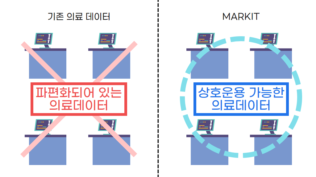 기존에는 의료 데이터들이 공유되지 않고 각 병원에 파편화된 상태로 존재하고 있었네. 이렇게 파편화된 데이터는 활용함에 있어서도 큰 제약 사항이 되었지. 하지만 MARKIT을 통해 의료 데이터들이 한군데로 모인다면, 상호운용이 가능한 데이터를 기반으로 그 활용 가능성을 증대시킬 수 있을걸세.