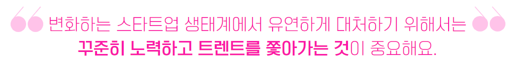 “변화하는 스타트업 생태계에서 유연하게 대처하기 위해서는 꾸준히 노력하고 트렌트를 쫓아가는 것이 중요해요. 항상 이 부분을 놓치지 않으려 공부하다 보면 어느새 단단하게 성장해있는 ‘나’를 발견할 수 있어요.”